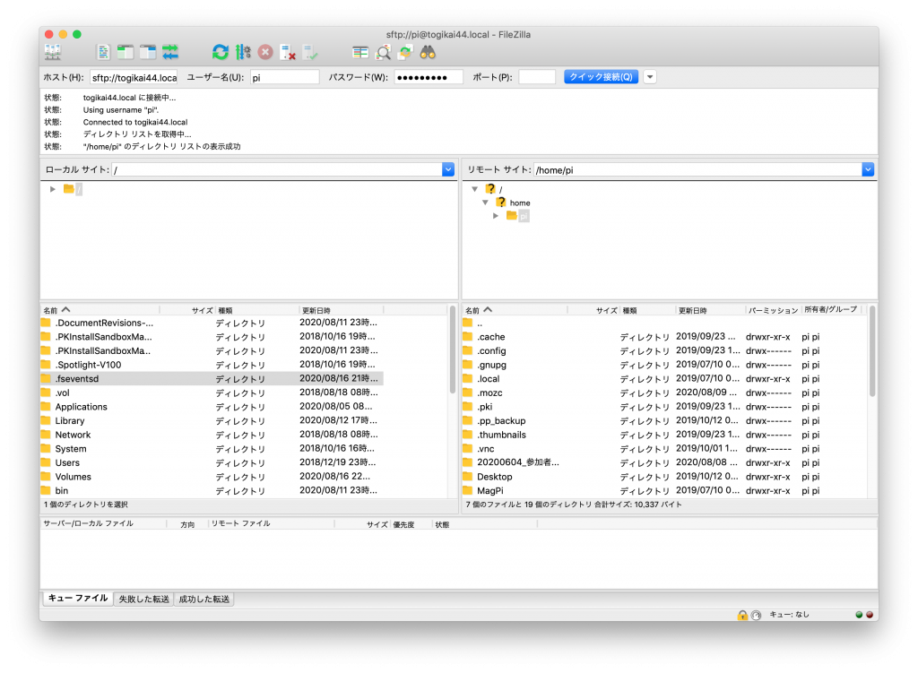 接続に成功すると、下の様な画面が表示されます。左側にローカル(パソコン等)、右側にラズパイのフォルダが表示されます。あとはドラッグ&ドロップで簡単にデータを転送できます。