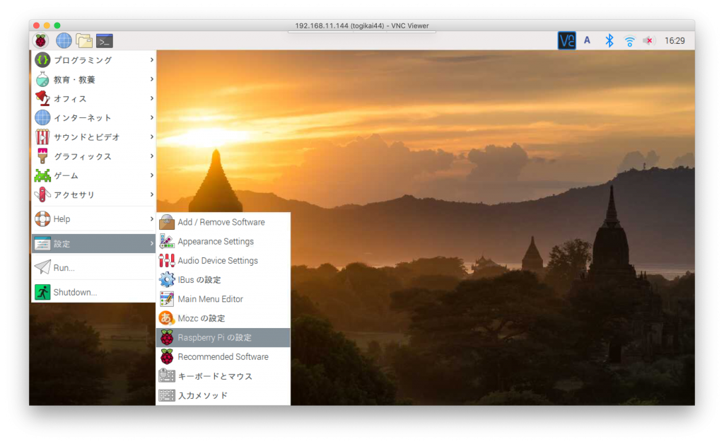 ラズパイを起動して、デスクトップのラズベリーアイコンから、[設定]→[Raspberry Piの設定]を選びます。