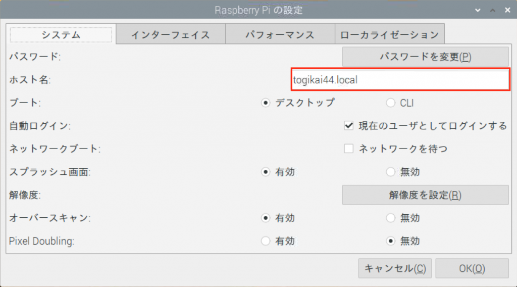[Raspberry Piの設定]の[システム]タブ内の[ホスト名]を変更することで、ラズパイのホスト名を変更することができます